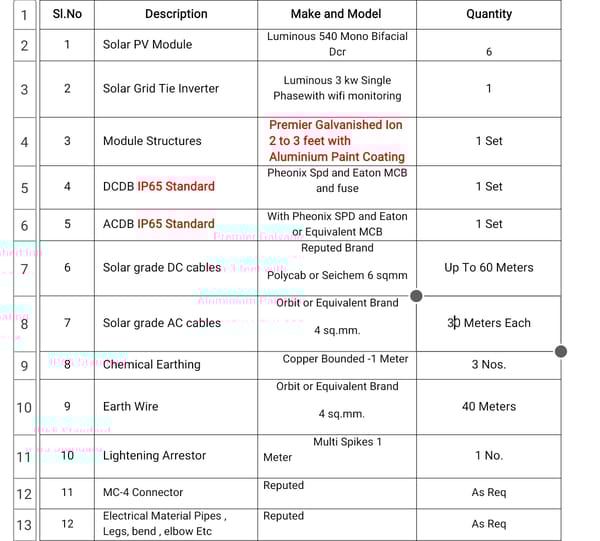 Elevate your energy independence with our Complete Solar Power Setup! This comprehensive package features cutting-edge Luminous 540 Mono bifacial solar PV modules designed to maximize energy production. Equipped with a robust 3kW WiFi monitoring solar grid tie inverter, you can effortlessly track your energy generation in real-time. Included are sturdy module structures and high-quality AC/DC cables to ensure a seamless installation process. The Premier Galvanized Ion structure is coated with durable aluminum paint for enhanced longevity and corrosion resistance. For added safety and reliability, the setup includes DCDB and ACDB compliant with IP65 standards, robust chemical earthing, and top-of-the-line lightning arrestors. This all-inclusive kit is perfect for those looking to harness the power of the sun with a turnkey solar solution. Free Installation all over Tamilnadu.