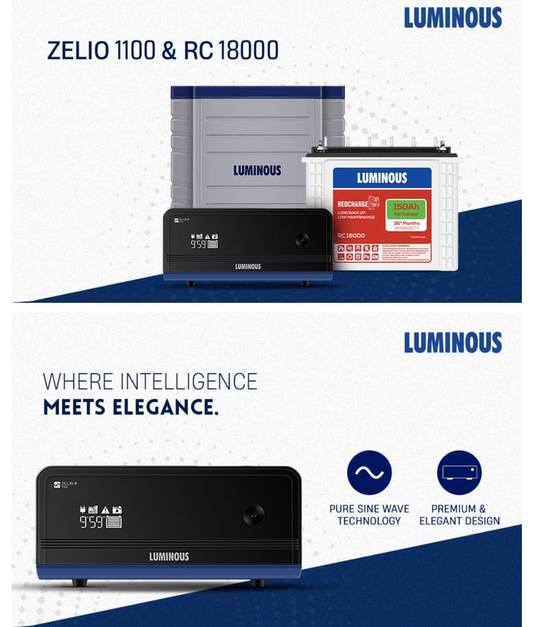 Luminous Inverter & Battery Combo with Trolley for Home, Shop & Office – Zelio+ 1100 (900VA/12V) Pure Sine Wave Inverter + RC18000 150Ah Tall Tubular Battery | 36M Warranty on Inverter & Battery